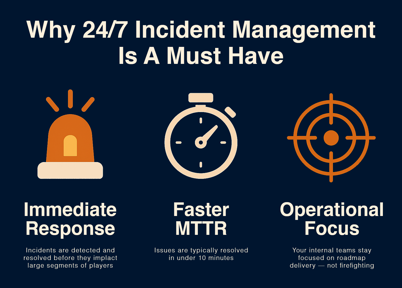 Today’s games run globally. That means issues can arise at any hour. If you’re relying on in-house coverage or on-call rotations, you’re exposed to unnecessary risk.